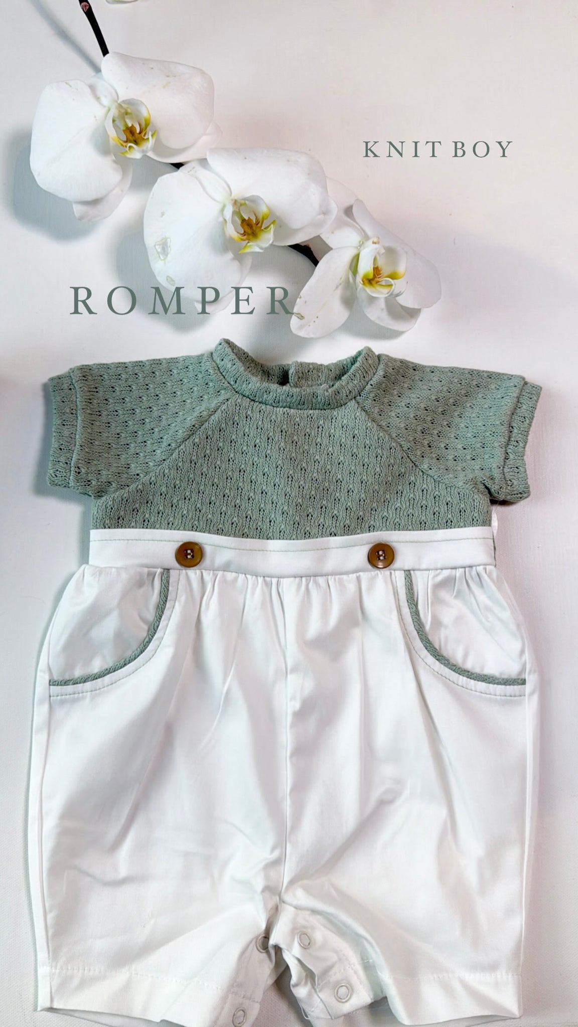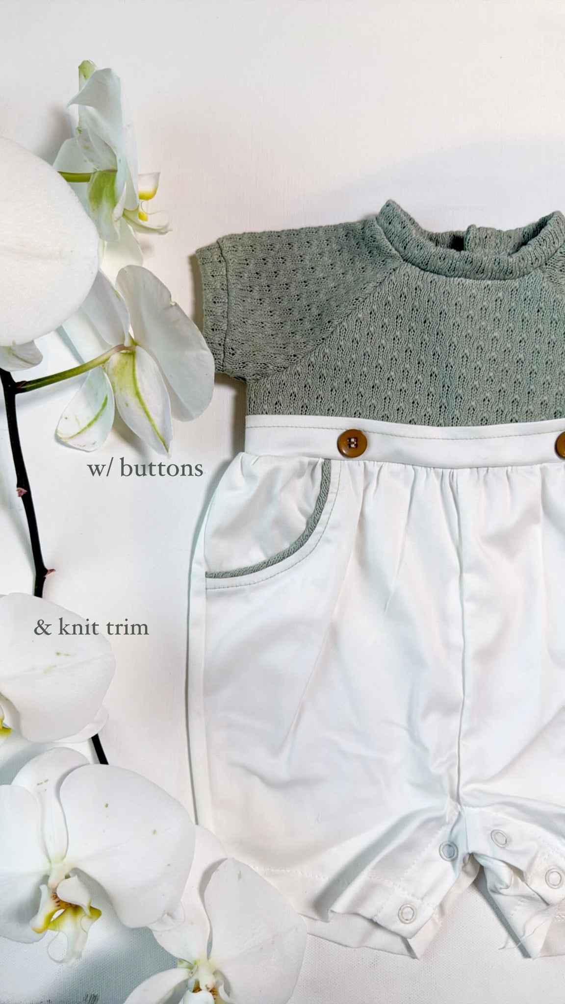 Sage knit romper with trim at pocket and buttons detail