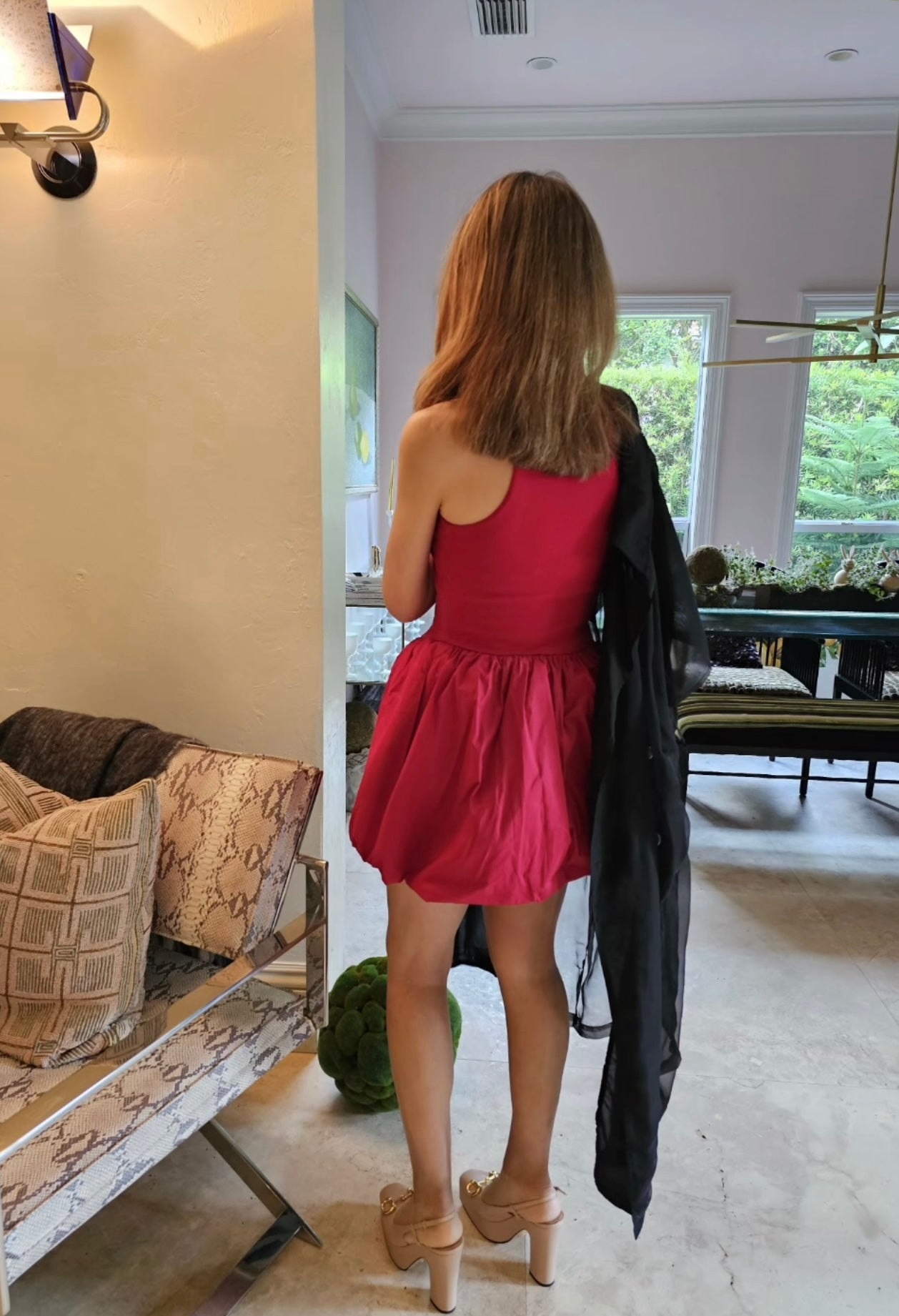Perfect for the Holidays! Red mini dress with a bubble hem.