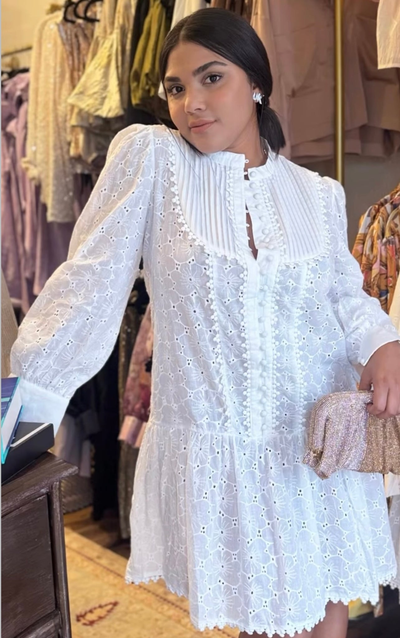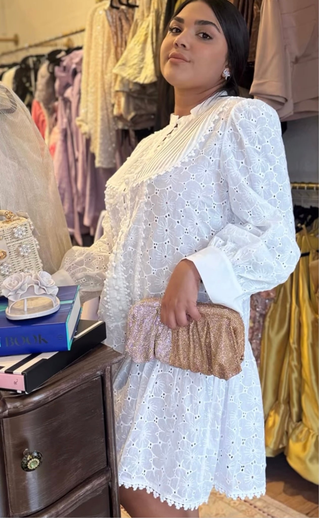 Exquisite front design detailed with embroidery, buttons, and pleats.