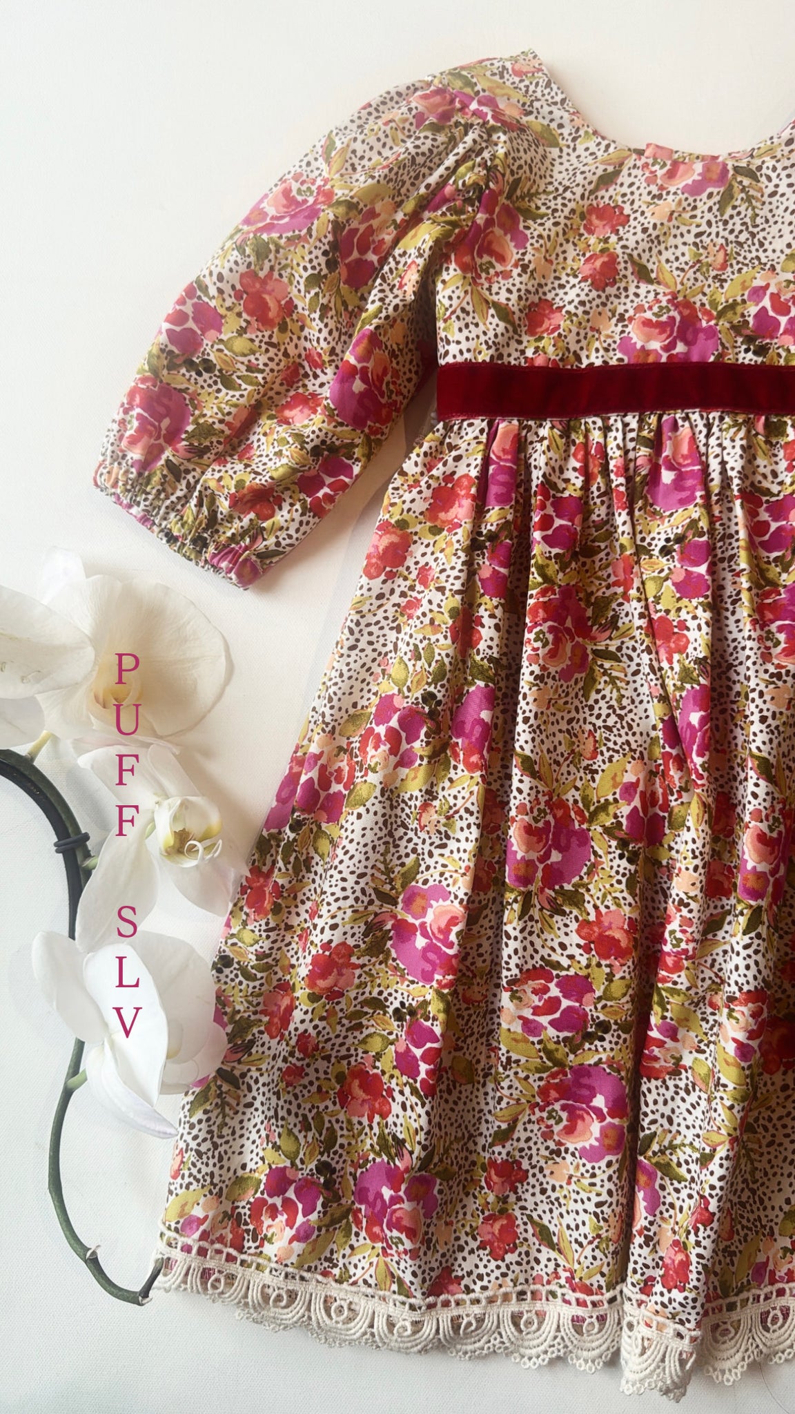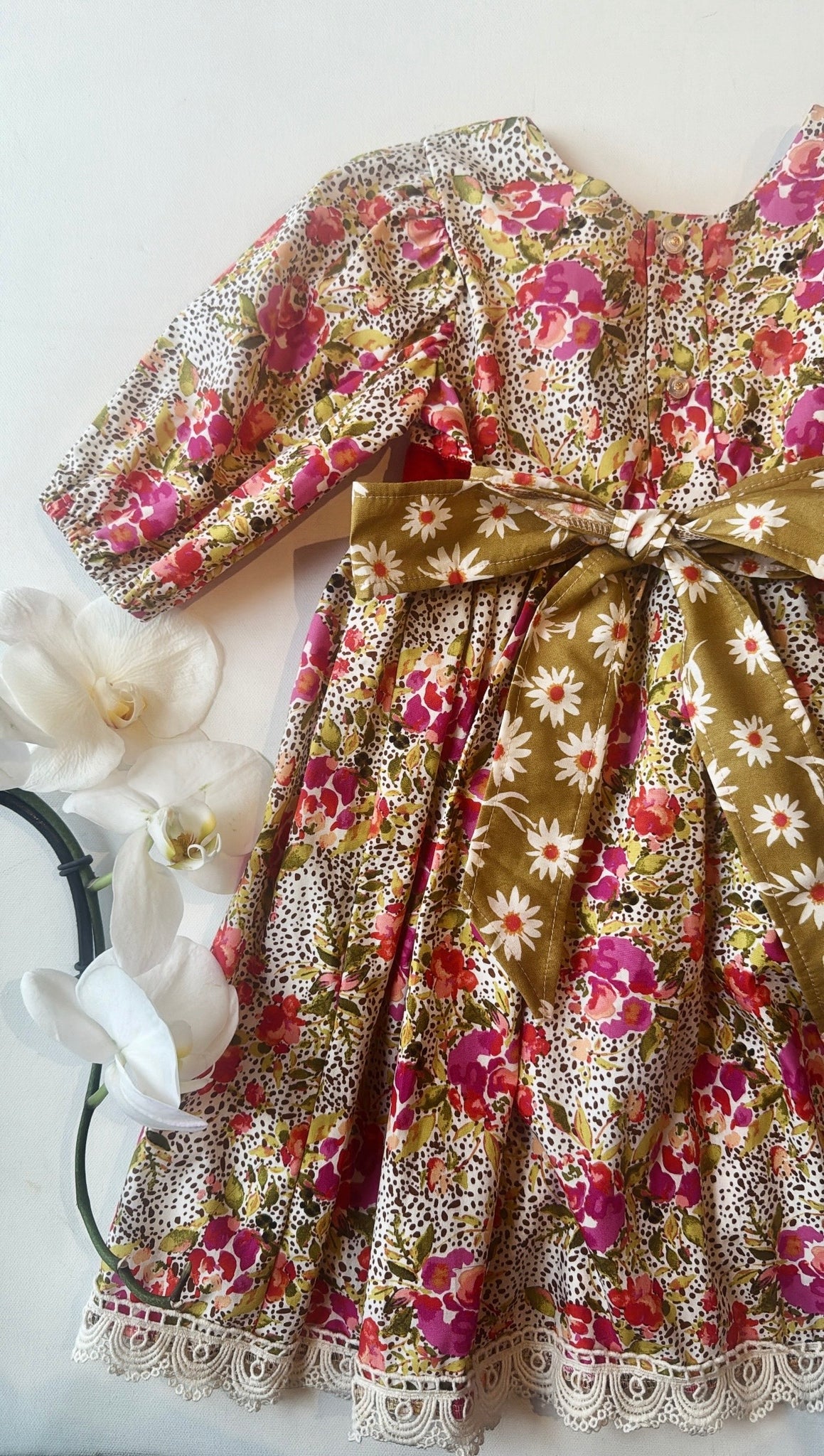 Stunning bloom dress with a delicate lace trim and a velvet front sash finished with a fun print.